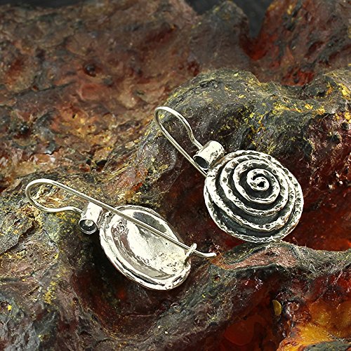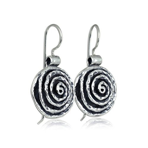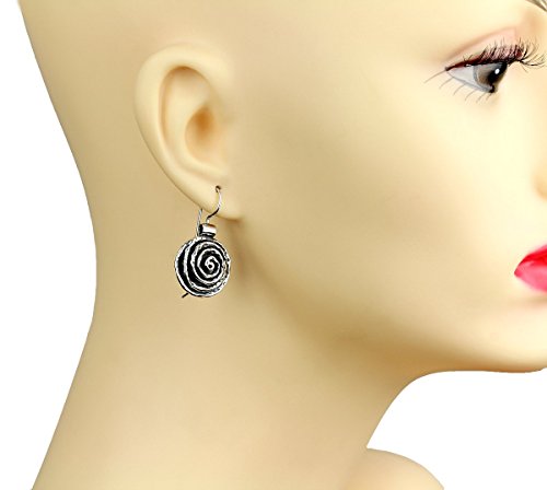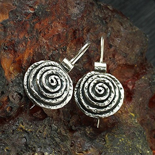 Impressive swirl round Sterling Silver earrings. 925 Sterling Silver round shaped earrings with spiral design and wire & hook secure backs. Unique artisan design.