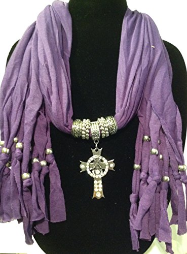 Product Description Purple Scarf with silver bead accent on tassel ends. Located in the middle is a clear crystal jeweled angel winged cross with silver beads located on either side. 0