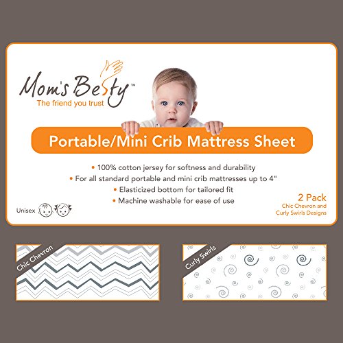 -. Binding : Baby Product -. Brand : Mom's Besty -. Color : grey, white -. EAN : 0784672980272 -. Feature : 100% cotton jersey 2-sheet pack - soft and gentle on baby skin / Universal use for standard Pack N Play Playard and Portable/Mini crib mat and mattress up to 24"x38"x4" (PLS MEASURE YOUR MATTRESS BEFORE YOU PURCHASE!) / Two fitted sheets with elasticized bottom for tailored fit and ease of use / Modern chevron and swirls, unisex fabric designs in grey and white, equally compliment boy's and girl's nursery themes / Easy care - machine washable for time saving and convenience -. IsAdultProduct : 0 -. Label : SDKings -. Manufacturer : SDKings -. Model : MB0060108UN -. MPN : 784672980272 -. PackageQuantity : 1 -. PartNumber : 784672980272 -. ProductGroup : Baby Product -. ProductTypeName : BABY_PRODUCT -. Publisher : SDKings -. Studio : SDKings -. Title : Pack N Play Playard Sheet Set – 2 Pack Jersey Cotton Fitted Sheets for Mini/Portable Crib Mattress by Mom’s Besty – Unisex Gray Chevron -. UPC : 784672980272
