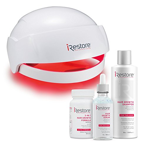 -. Feature : FDA-CLEARED FOR MEN & WOMEN - iRestore is a medical device that treats hair loss and thinning hair using clinical-strength laser therapy; / SEE RESULTS OR YOUR MONEY BACK - You can expect to see visible improvement in your hair conditions in as little as 12 to 24 weeks with regular use of the device (25-minute sessions, 3 times weekly); / GROW THICKER, HEALTHIER HAIR - Whether you want to regrow fuller hair or simply improve hair quality and volume, laser therapy is a easy and reliable solution for your hair that's non-invasive, drug-free, and has no negative side effects; / AT-HOME HAIR RESTORATION THERAPY - Experience clinical-strength laser technology in your own home; this hands free device allows you to go about your day uninterrupted - unlike laser combs/brushes. Developed in GMP-certified facilities, this device is durable, lightweight, comfortable, and easy to use; / CLINICALLY PROVEN TECHNOLOGY - Low-level laser therapy is clinically proven to promote hair regrowth; physicians believe laser therapy can be used to accelerate the results of other hair growth treatments. This package includes: 3-in-1 Hair Growth Formula, Hair Growth Shampoo and Hair Growth Serum