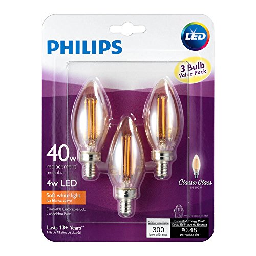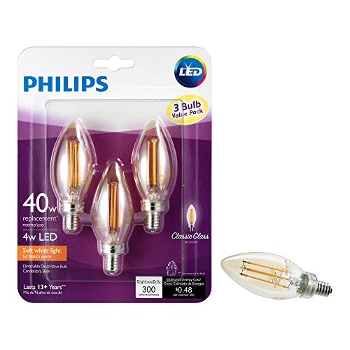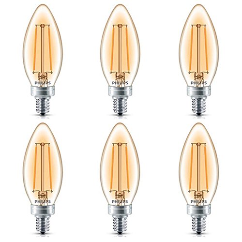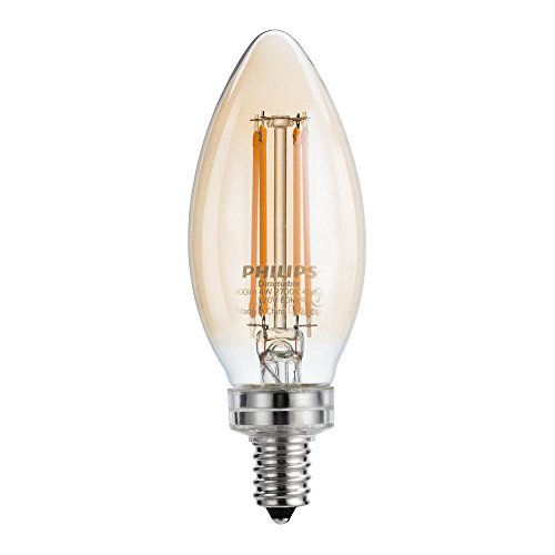 - Philips B11 Vintage Amber Glass Decorative Candle LED light bulbs are made to be seen with a warm glowing filament that shines with 40-watt equivalent, amber dimmable light, with 80% less energy use. These bulbs fit small candelabra (E12) fixtures.