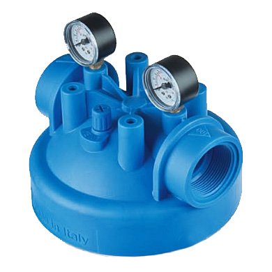 -. Feature : 1.5 Inch FNPT threaded inlet/outlet filter head made of reinforced polypropylene / Equipped with filter wrench, mounting bracket and hardware / Transparent housing made of safe PET (polyethylene) plastic / Two lead free pressure gauges to indicate filter cartridge pressure differential / Three 5 micron dirt, rust and sediment filters - Housing accepts any universal 4.5 x 9.75 inch cartridge