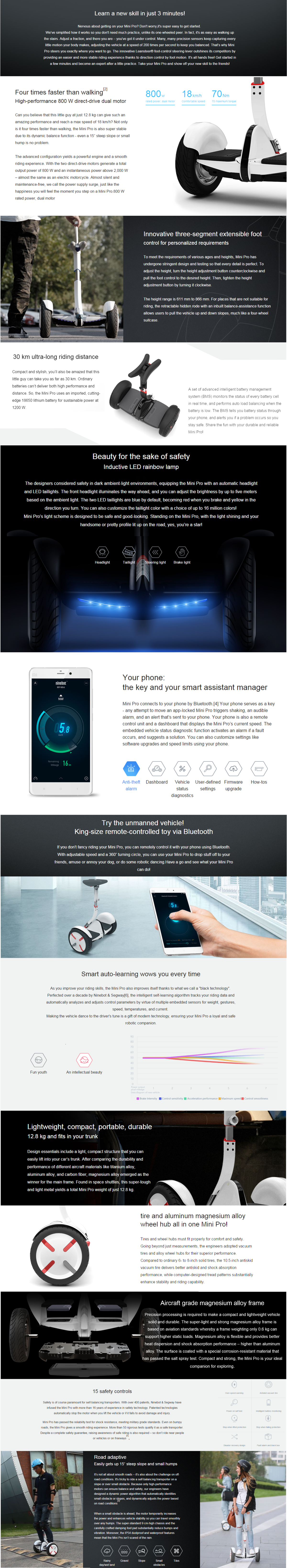 Easily mastered within a few minutes, the self-balancing Ninebot Mini utilises gyroscopic technology; the same technology found in Segway. With precision sensors capturing every little motion your body makes, the Mini adjusts at the speed of 200 times per second to keep you well balanced. Two sensors (one under each foot pad) detect the micro-movements in your feet and ankles, and relay that information to the motors. Just point your toes down to go forward, and put your weight into your heels to go backwards. The innovative Leansteer® foot-control steering lever controls the direction that you turn.