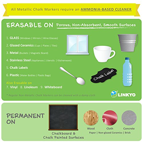 - Feature : Metallic GOLD & SILVER Artist-Quality Chalk Marker Pens featuring reversible tips - choose the 6mm chisel tip for broad coloring or the 3mm round bullet-point tip for narrow lettering and precision drawing / Long Lasting and Quick Drying - Get the Look of Chalk Without all the Dust & Smudging / Erasable on Non-Porous Materials with an Ammonia-Based Cleaner, Permanent on Porous Materials (PERMANENT ON CHALKBOARDS!) / Non-Toxic - 100% Water Based. No Dust, Fumes or Harsh Chemicals; Safe Around Children and Animals / Fun and Practical - Perfect for Crafting and DYI Projects, Teaching, Kid's Crafts, Office Brainstorming, Café, Pub and Bistro Menus, Window Decorating, Personal Messages & Reminders ... the possibilities are endless