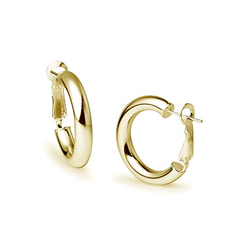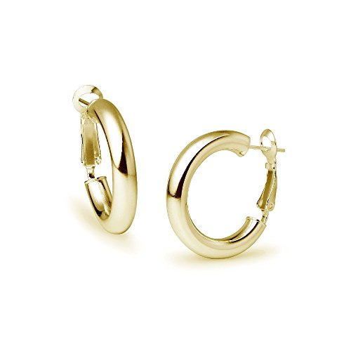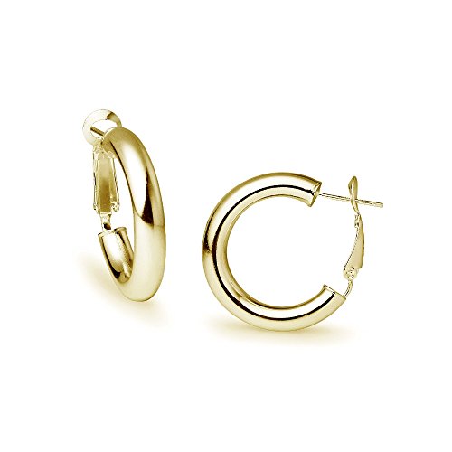 These earrings feature yellow gold flashed sterling silver high polished round clutchless hoops. They are 5mm thick and are 25mm in diameter.Feature