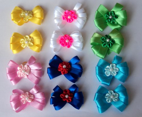 -. Feature : This is for a total of 6 pairs of different color pixie dog bows. / Each dog bow has a base design of a daisy flower and a center decoration of a cherry flower with a white pearl. / These bows are designed for St Patricks Day, Easter, 4th of July, etc / It is a wonderful pack to dress up your pampered pet for the holidays / East bow has a double looped rubber band for easy attaching to your dog hair (See the 2nd picture above shows the back of the bow has the highly elastic rubber band)