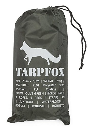 Das original Tarpfox Tarp besitzt 19 Fixierpunkte, 4 Abspannseile, 4 Erdnägel und ist mit seinen 2,9m x 2,9m und einem Gewicht von 750g ideal für jedes Terrain. Mit seinem reißfesten Material aus PU beschichtetem (1500mm) Polyester (210T) ist das Tarp extrem wasserdicht und schützt vor Sonneneinstrahlung. Durch die Schlaufenverteilung auf der Plane ist das Tarp vielseitig einsetzbar und kann als Zeltdach, Plane, Sonnenschutz, Regenschutz und Windschutz für Personen, Ausrüstung oder sonstige Gegenstände benutzt werden. Alle Nähte sind hochwertig verarbeitet und wasserdicht versiegelt. Der Tarpfox ist für extreme Outdooreinsätze konzipiert, kann aufgrund seiner Flexibilität aber auch problemlos im Garten oder auf der Terrasse benutzt werden. Die Farbe der Tarps und des mitgelieferten Beutels ist olivgrün.extrem robust