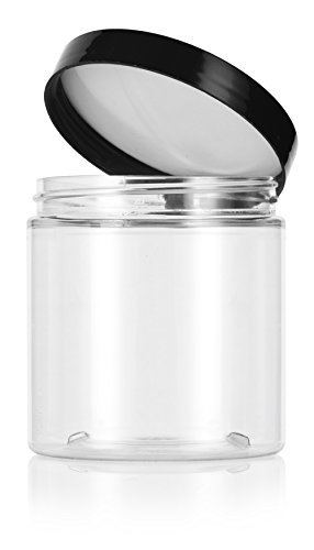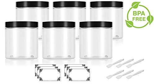 - Includes 6 - Clear PET Plastic 8 oz jars with black smooth foam lined lids + Spatulas and Labels