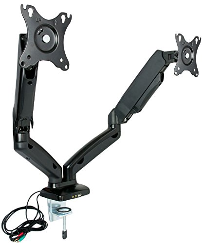STAND-V002O is a dual monitor gas spring mount that holds two side by side screens from VIVO. The counterbalance gas spring arm allows for simple height adjustment without the use of tools and is fully adjustable allowing you to set your monitors to almost any viewing angle. The mount features a heavy duty bolt style 4" c-clamp. Also featured is an integrated cable management system. STAND-V002O is compatible with VESA 75mm x 75mm and 100mm x 100mm and fits two screens up to 27" in size and 14.3 lbs in weight each. Monitors can be smoothly rotated between landscape or portrait position. The open top slots on the VESA face plates make mounting your monitors a breeze.