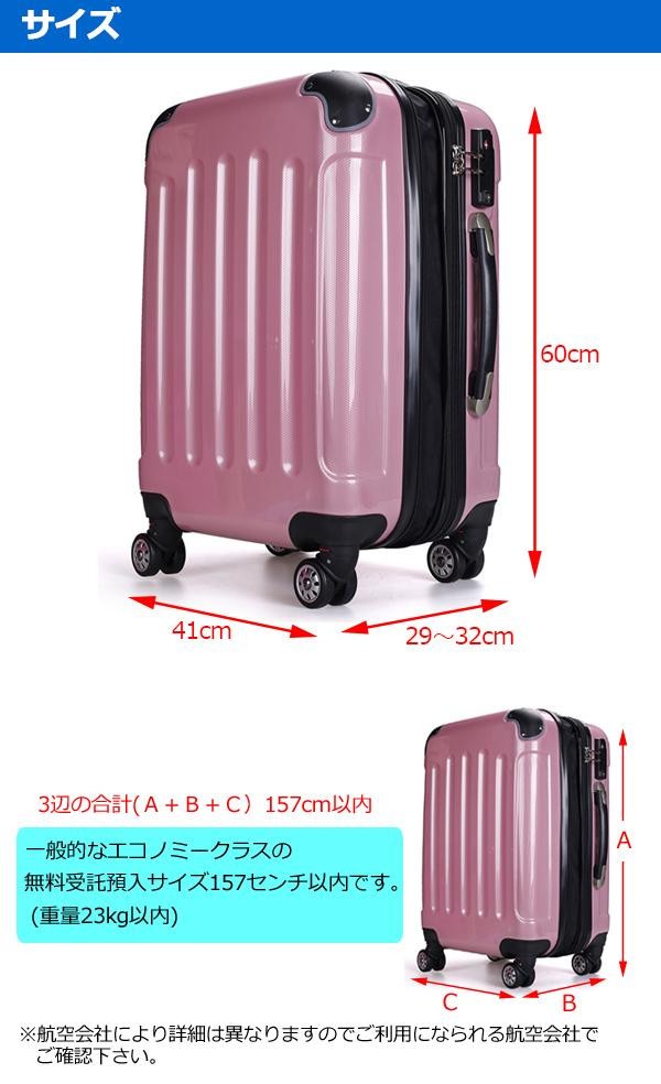 | 仕様 | 容量:約60~65L 拡張機能 キャスター8輪(Wキャスター×4) TSAロック搭載 無料受託預入サイズ(157センチ以内) |
