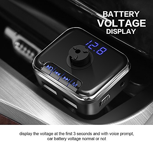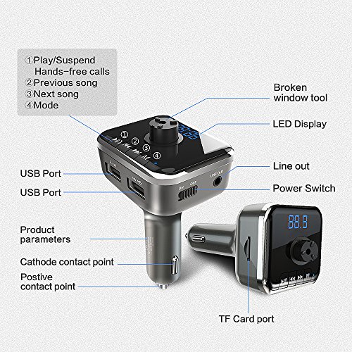 Multi-purpose Design: The wireless in-car Bluetooth transmitter with emergency escape tool, supporting dual USB car charging, hands-free calls, data transmission by TF card and car battery voltage detection display