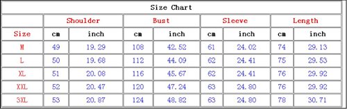 M:Shoulder:19.29"/49cm.Bust:42.52"/108cm.Sleeve:24.02"/61cm.Length:29.13"/74cm. L:Shoulder:19.68"/50cm.Bust:44.09"/112cm.Sleeve:24.41"/62cm.Length:29.53"/75cm. XL:Shoulder:20.08"/51cm.Bust:45.67"/116cm.Sleeve:24.41"/62cm.Length:29.92"/76cm. XXL:Shoulder:20.47"/52cm.Bust:47.24"/120cm.Sleeve:24.80"/63cm.Length:29.92"/76cm. 3XL:Shoulder:20.87"/53cm.Bust:48.82"/124cm.Sleeve:24.80"/63cm.Length:30.71"/78cm.