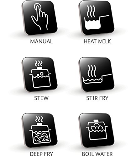 -. Feature : Praktische Induktionskochplatte mit 6 voreingestellten Kochprogrammen: Heiße Milch, Köcheln, Braten, Frittieren, Wasser kochen & Manuell / 9 verschiedene Temperatur-Einstellungsmöglichkeiten (450 - 2.100 Watt) / 12 - 26 cm Druchmesser geeignet / Auto Off nach 5 Minuten ohne Funktionsbetätigung / Alarmsignal wenn kein geeignetes Kochgerät benutzt wird