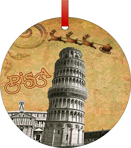 Vintage Santa and Sleigh Riding Over Leaning Tower of Pisa-Tuscany-Central Italy-Double-Sided Round Shaped Flat Aluminum Christmas Holiday Hanging Tree Ornament. Made in the USA!
