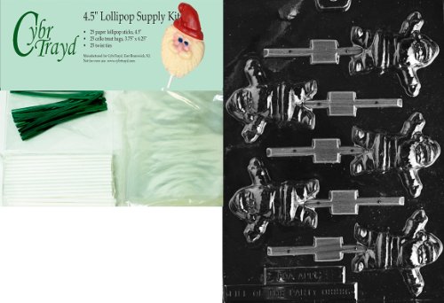 CHUBBY WAVING SANTA Christmas Chocolate Mold w/Lollipop Suply Kit (25 Lollipop Sticks, 25 Cello Bags, 25 Green Twist Ties, Molding Instructions)