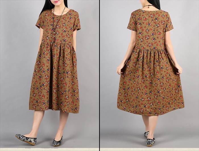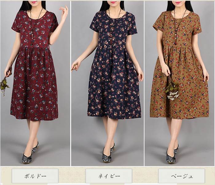 ・レトロな花柄が大人の雰囲気を引き立たせる、半袖フレアワンピース。・落ち着いた配色の甘すぎないレトロな花柄なので、クセが少なく幅広い年代の方にご愛用頂けます。・ウエスト部分にたっぷりとタックをとる事でAラインを作り出し、女性らしいゆったりとしたシルエットを演出。・麻を配合したサラっとした素材を使用し、程良く厚みのある生地なのでロングシーズンお楽しみ頂けます。 ●サイズ展開 【M】着丈102cm バスト90cm 肩幅38cm 袖丈17.5cm 【L】着丈103cm バスト94cm 肩幅39cm 袖丈18.5cm ※平均での採寸となりますので、多少の誤差が生じる場合がございます。ご了承くださいませ。●カラー展開 ベージュ ボルドー ネイビー●商品詳細 【素材】:コットン・リネン 【透け感】:なし 【厚み】:普通【裏地】:なし 【シルエット】:ゆったり 【伸縮性】:なし【付属品】:なし (コーディネート使用の衣類、アクセサリー等は付属しません)20代 30代 40代 50代 人気 レディースファッション 大きいサイズ