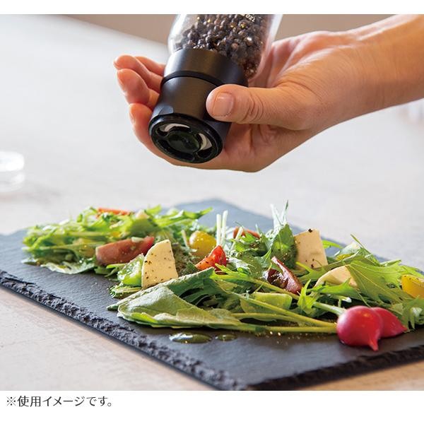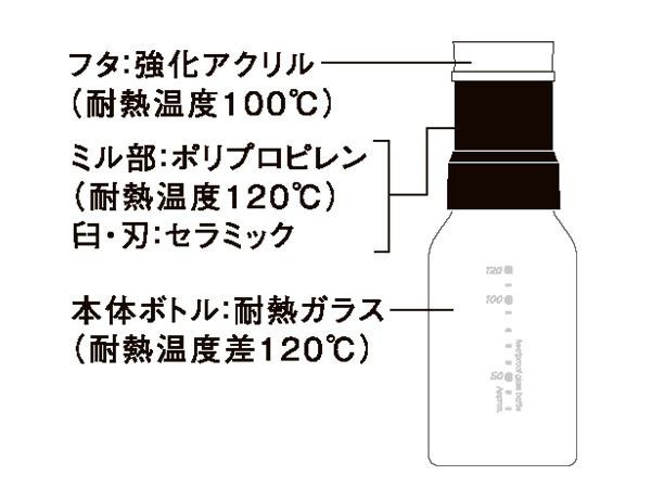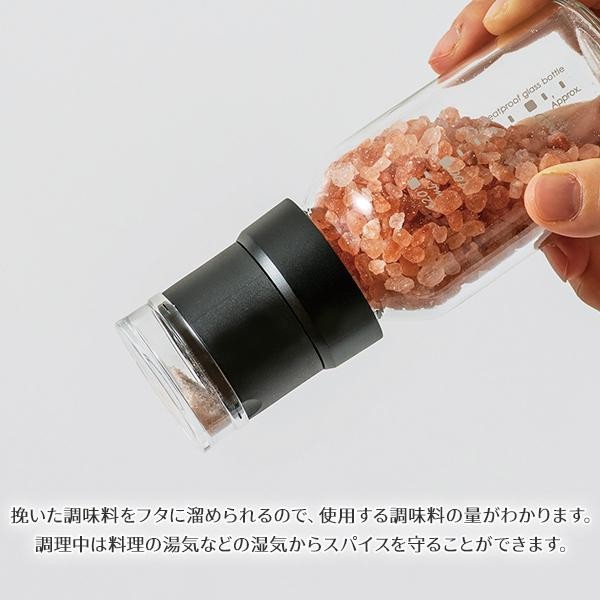 ボトル部分は、色やにおいの移りにくい耐熱ガラス製です。岩塩、ホールペッパー、ドライガーリックなどにお使いいただけます。