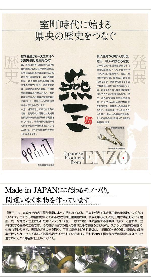 | 「燕三」:室町時代に始まる新潟県央の歴史をつなぐ~早くから鍛冶が行われ、日本一のハウスウエア生産地と成長した新潟県燕市。そこから道具作りの原点に立ち、先人への感謝と、地域の誇りで生み出されたのが、『燕三(ENZO)』です。「変わらない形には、意味がある。」繊細な和食に必要なのは、絶妙な火加減。沸騰する直前に取り出す、素材の表面の変化を見逃さない、小さな目配りと心配りが仕上がりを左右する。長い間、プロの目が認めてきた形。本格派を目指したくなる逸品がここにあります。 |