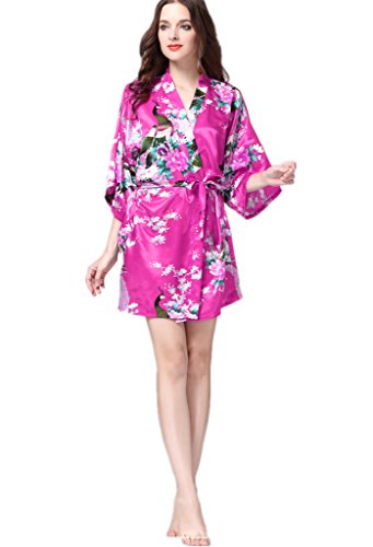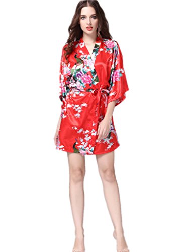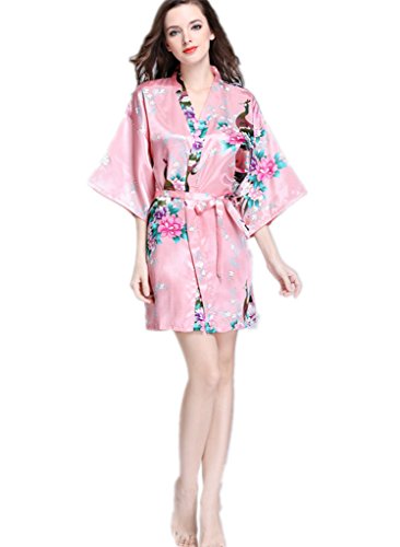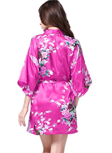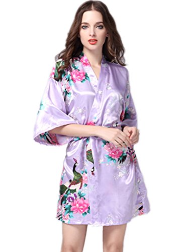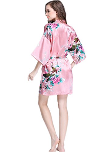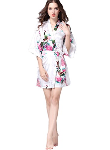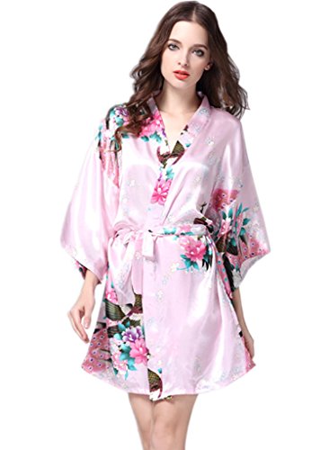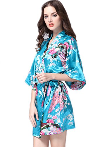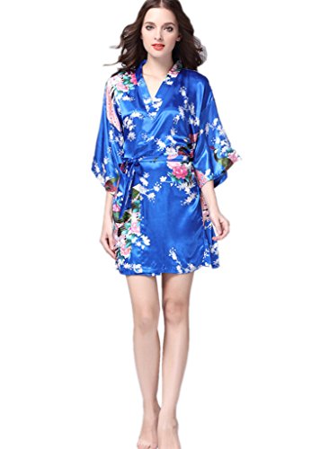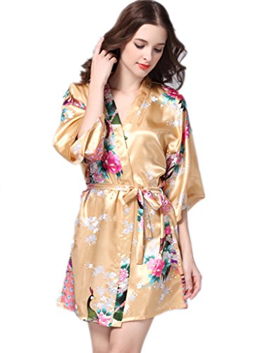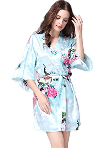 YUAKOU Women's Short Kimono Robes Peacock Blossoms Silk Nightwear Bathrobes