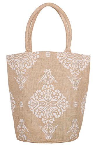 KAF Home Jute Bucket Bag with White Indian Print, Durable Handle, Reinforced Bottom and Interior Zipper Pocket, Generous capacity, 12.5" tall x 17" wide x 7" deep