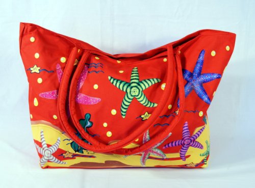 Waterproof Jumbo Red Canvas Beach Tote Bag Sea Starfish Design Zipper Closure 24 X 15 X 6"