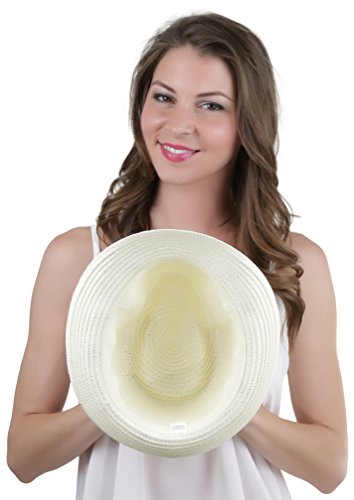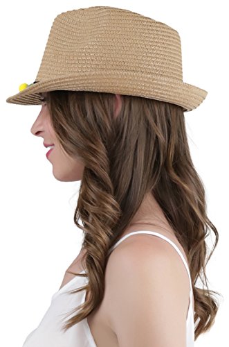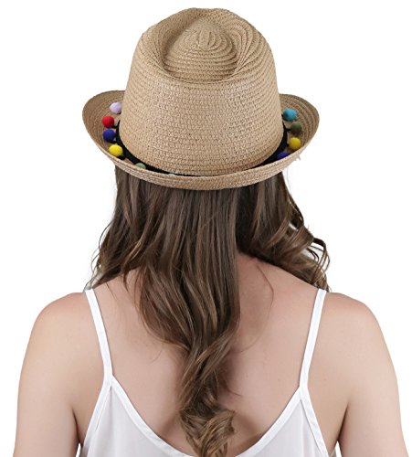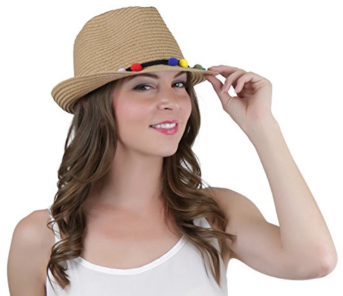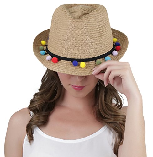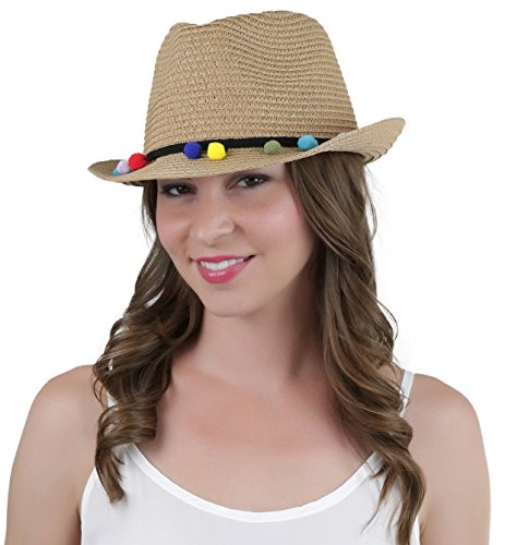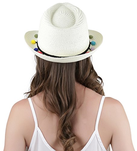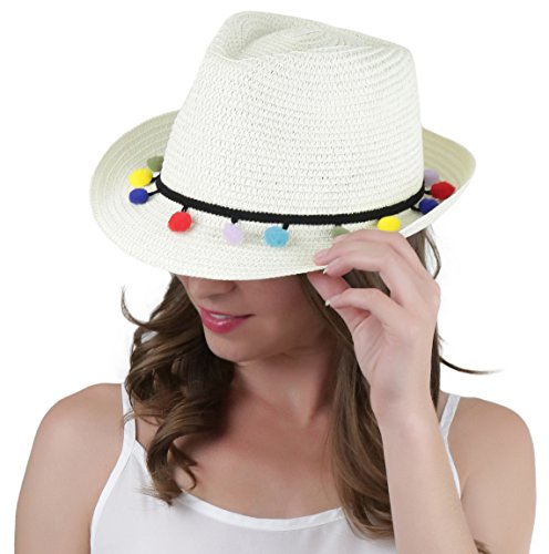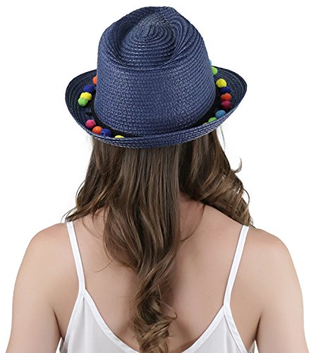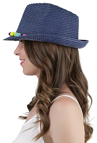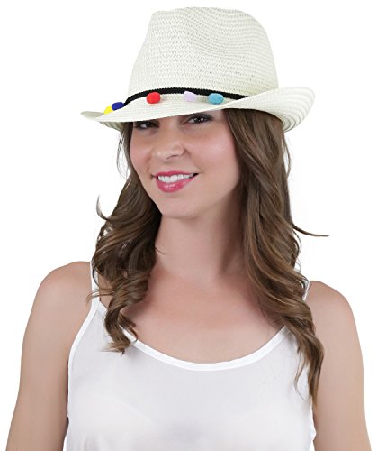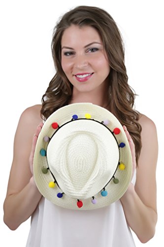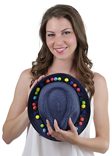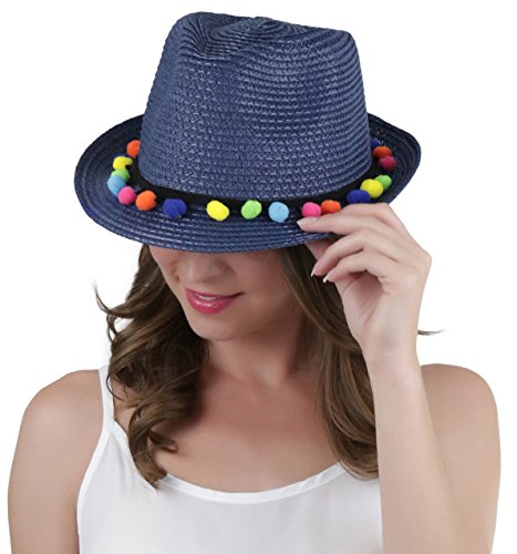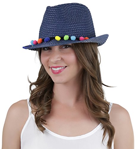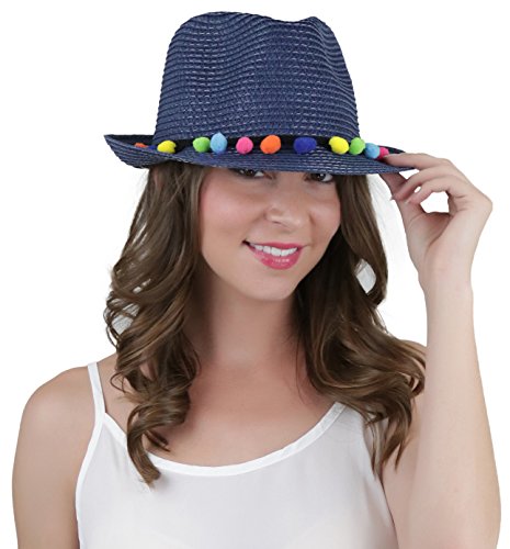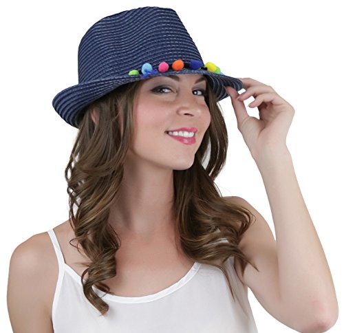 ToBeInStyle Women's Black Ribbon with Rainbow Cotton Ball Detail Fedora