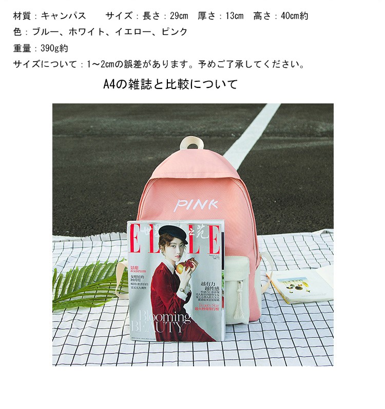 材質:表面:キャンパス 裏面:ポリエステル色:ブルー、イエロー、ホワイト、ピンク重量:400g約サイズ:長さ:29cm約 高さ:40cm  厚さ:13cm約商品内容:1xバックバッグ 特徴:【高品質】高品質なキャンパスとポリエステルで作って、バッグの品質が保証です。【大容量】大容量のバックバッグですが、ノードパソコン、ipad、本などがすべて収納できます。【簡単なデザイン】簡単なデザインなので、通勤はもちろん通学?ビジネスなど幅広いシーンで活躍!