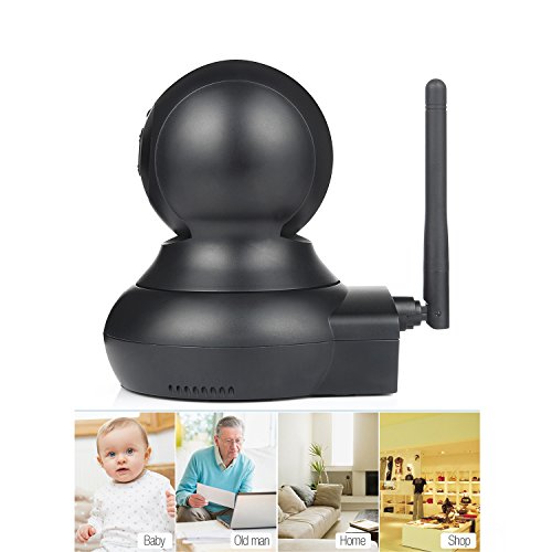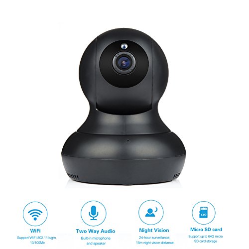 -. Feature : New Smart home IP security camera to monitor your warm-home, support Cloud P2P, Quick wired/wireless network connection. / 1280X720P video recording cheapest wireless camera with 1.0MEGA lens for home security surveillance / Pan 355degree/tilt100 degree rotating surveillance camera for home security system / 13 LED lights with night vision sensor, Distance up to 30ft,support IR cut ,snapshot and recording and never wory about dark place.remotely triggerrd and controlled camera by Andriod &IOS smartphone wherever you are / Anti-burglar camera to push notice your phone, Motion detection alarm, Built in Microphone and speakers. You can talk and listen to your families or friends on a mobile device. Supporting video monitor records to micro SD card 64GB (not included).