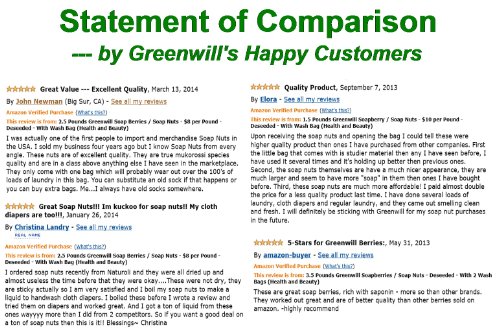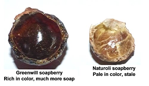 -. Feature : Comparison --- See picture for the huge difference in appearance. Other soapberries in the market (X-ed in the picture) are all from India or so-called Himalaya region. Greenwill soapberry has much more soap content, richer in color (dark red), fresher and fully sun dried, deseeded but still in whole shell (not in pieces), never flaky as others do, and come with extra large 4"X4" cotton wash bag. / Green Detergent --- Housewives wash dishes by hands in China. It is a common sense there that washing with soapberry will not hurt hands. Chinese soapberry has very strong natural cleaning power. Use Greenwill soapberry in laundry makes your clothes not only clean but also soft and fresh. The brochure with the item helps you find ways to use soapberry suit your lifestyle. / Green Cosmetic --- In China, soapberry is used mainly for skin and hair care. Normal human skin is weak acid. Soapberry juice PH value is between 5~7. Most commercial cosmetic products are alkaline they neutralize the acidic environment in human skin that causes water loss and disorder of the water/oil balance. See brochure and try this amazing natural cosmetic. / Special Offer --- 4 Oz, quarter pound, ~60 deseeded berries. Also Include 6-page brochure and 1 wash Bag which is hand made with 100% natural cotton. Double drawstrings. No mark or ink. Extra heavy-duty and durable. Super Large 4"X4" for berries roll inside and release soap better. Greenwill Soapberry is the only real mukorossi species (the best soapberry) in market. Come from the origin of soapberry. Search in USDA homepage by 'mukorossi' or 'Chinese soapberry' to find out they are the same. It makes your laundry very clean, fresh, and softer than ever. See more soapberry function as green detergent and cosmetic in our website. / Organic Product --- Greenwill is the only approved ORGANIC soapberry brand by China authority. Greenwill soapberry is completely natural, where no pesticides, insecticides, chemical additive, or any artificial mediums have ever been used. Greenwill soapberry has been tested by independent labs in China, USA, Japan, Australia, and France. All testing results show our soapberries are safe, not toxic or infectious, including ones from US Agriculture Quarantine (CBP-AQI) and Plant Protection and Quarantine (PPQ). See more info about organic approval in enclosed brochure or in Greenwill website.