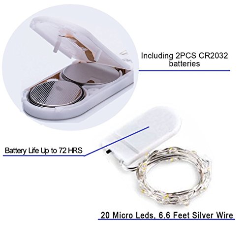 -. Binding : Kitchen -. Brand : LRCXL -. Feature : String Length:2M/6.5FT,Total LED bulbs:20LEDs. / Light string is submersible but battery pack not submersible. / Small battery pack is easy to hide. / Offer 48 hours lighting, the 2*CR2032 batteries can be replaced easily. / Portable: you can easily carry and place the lights anywhere you like. -. IsAutographed : 0 -. Label : LRCXL -. Manufacturer : LRCXL -. ProductGroup : Home -. ProductTypeName : HOME -. Publisher : LRCXL -. Studio : LRCXL -. Title : LRCXL Pack of 12 LED Moon Lights 20 Micro Starry LEDs on Silver Wire,2 x CR2032 Batteries Included,6.5 Ft (2m) for DIY Wedding Centerpiece or Table Decorations