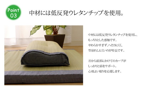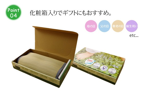 通常イ草商品で行われる「泥染め」という工程を抜き、イ草本来のすべすべとした質感にこだわったイ草枕です。長時間、肌に接する寝具だからこそ、自然素材を使い柔らかな質感にこだわりました。快眠い草の効能として1.綿の約2.5倍の吸湿力 2.蒸れにくい。汗による湿気を吸うことにより温度を下げ快適な就寝を促します。 3.汗のにおいを軽減。汗のにおいの元となる化学物質を90%以上抑えます。などがあります。国産(九州産)のしなやかなイ草を使用していますので、柔らかく、すべすべしたとした肌触りです。本商品はさらに、い草にプレス加工を行うことで、通常のイ草枕に比べ凹凸を無くしております。肌、お顔に寝痕がつきにくい仕様に仕上げました。『イ草の枕で寝るのは気持ちいいけど顔にイ草の痕がつくのが嫌だな』という方におススメの商品です。お仕事のちょっとした休憩時間の仮眠にも最適です。中材に低反発ウレタンチップを使用しています。柔らかすぎず、ヘタリにくく、型崩れしにくいのが特長です。化粧箱入りでお届けしますので、贈り物にもぴったりです。※箱のデザインはイメージです。予告なくデザインが変更になる場合があります。ご了承下さい
