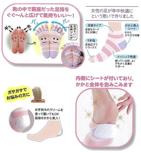 女性の足が年中快適に!!という思いで作りました。5本指は、足指をぐぐ~んと広げてリラックス。かかとは内側にシートが付いており、かかと全体を包みこみます。お手持ちのクリームを塗ってもOK!! |
