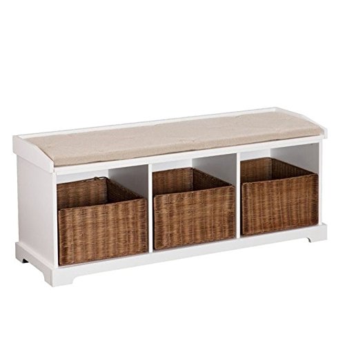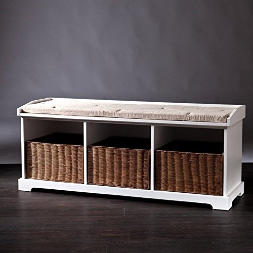 -. Feature : Finish: White / Material: Particle Board, Manufactured Wood, Birch Veneer, Plywood, Rattan, Linen, CA Foam / Traditional Style / Low profile storage bench perfect for small spaces / Features 3 rattan baskets for storing all your necessities