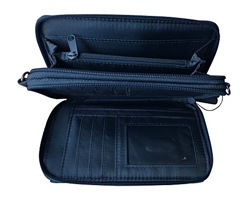 A second zippered compartment includes all the components of a well-organized wallet: a large bill pocket, eight credit card slip pockets, four slip pockets and an ID window