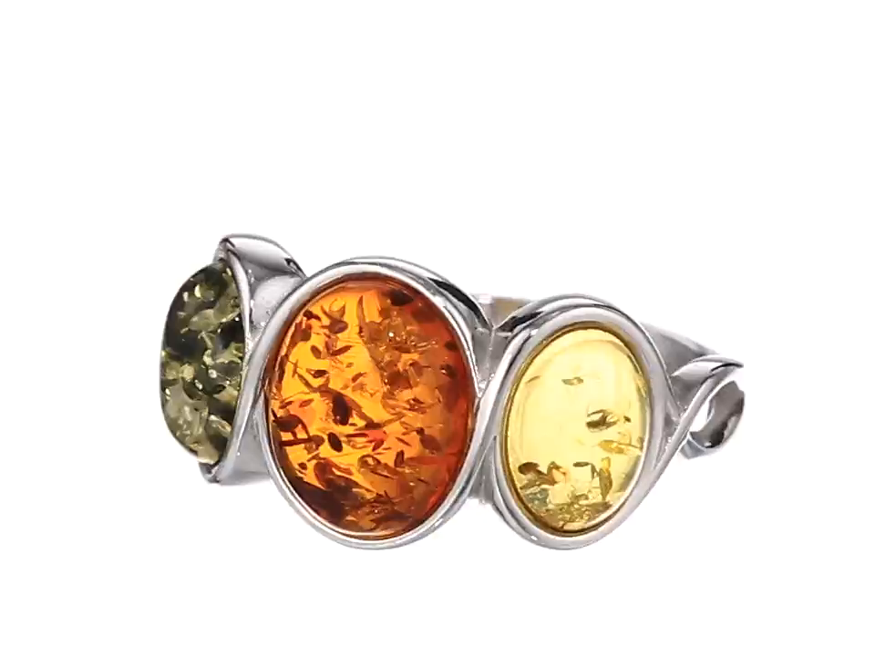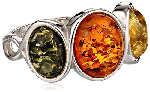 Rhodium Plated Sterling Silver Multicolor Amber Ring, Size 7