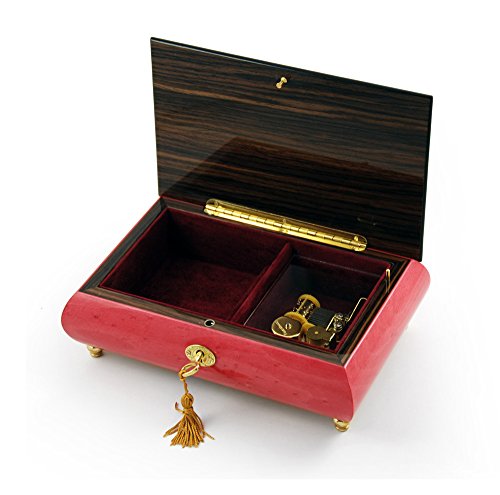 -. Feature : Tune: 18 note movement (please choose above option for available song titles) / Wood inlay: Violin centerpiece against a music them backdrop / Exterior: wine stain / glossy finish /with black lacquer trim / Interior: lined in red wine suede, open compartment / Wood/Hardware: burl-elm and rosewood / gold hardware / Lock and key w/ tassel