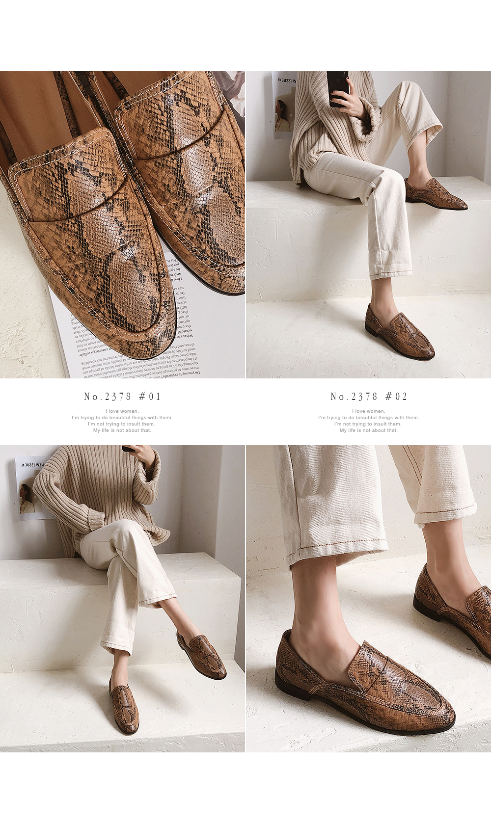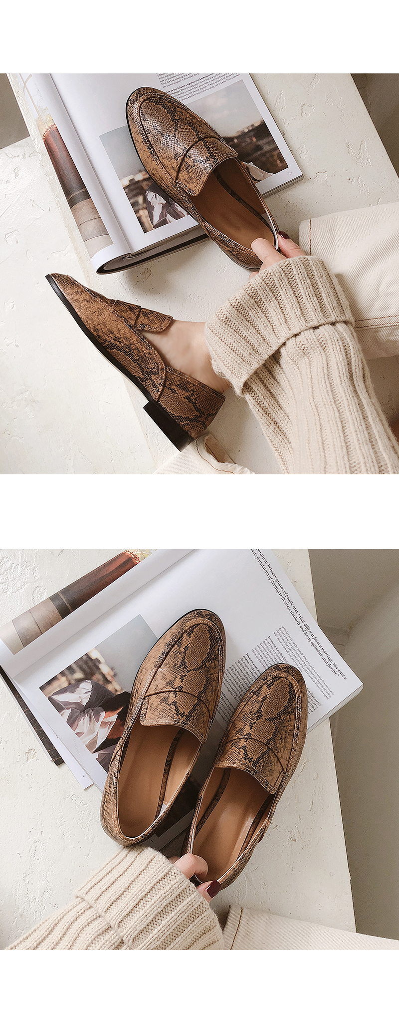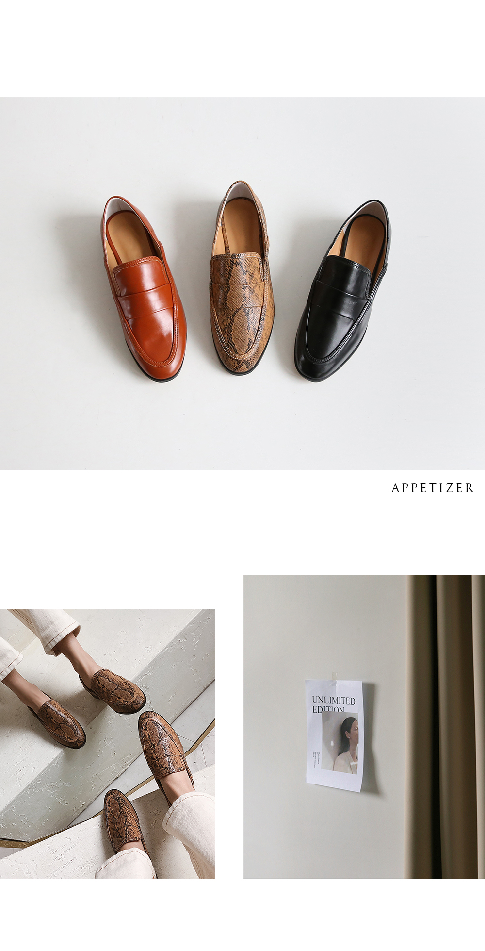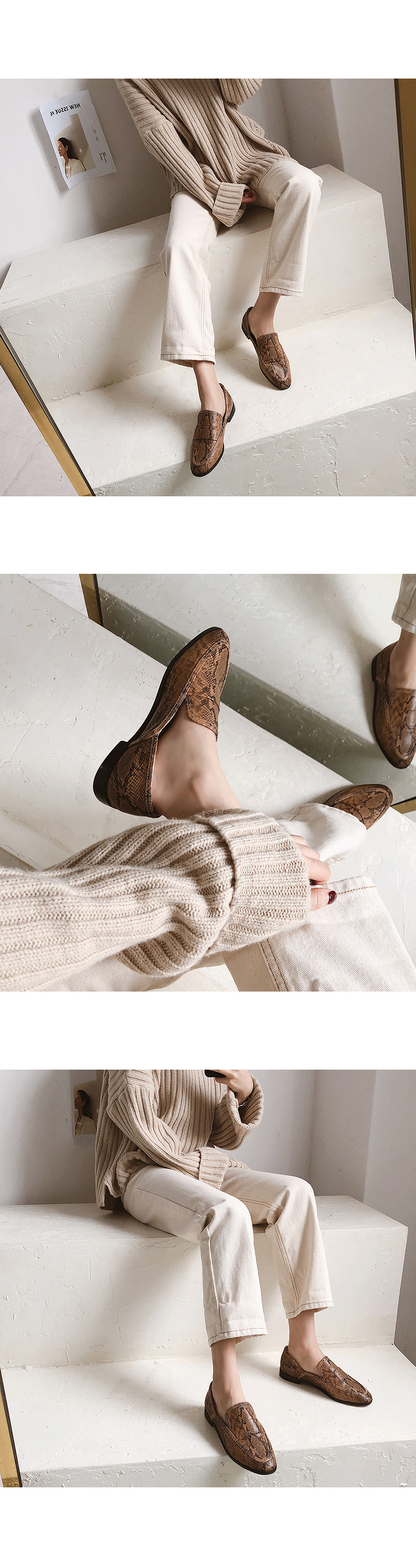 DETAILS - 소재 : 인조소가죽 - 컬러 : brown,snake,black - 피팅감 : 정사이즈 / 무게 : 보통인편 - 착화감 : 편해서 데일리 슈즈로 좋아요 - 모델피팅 : 230