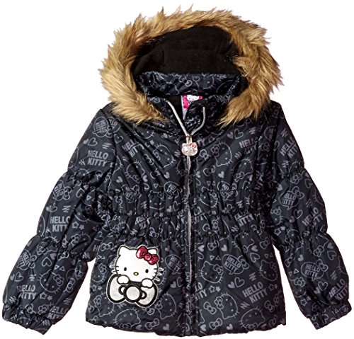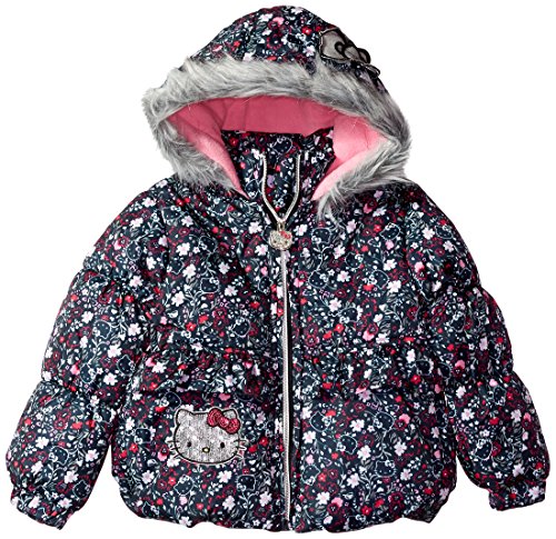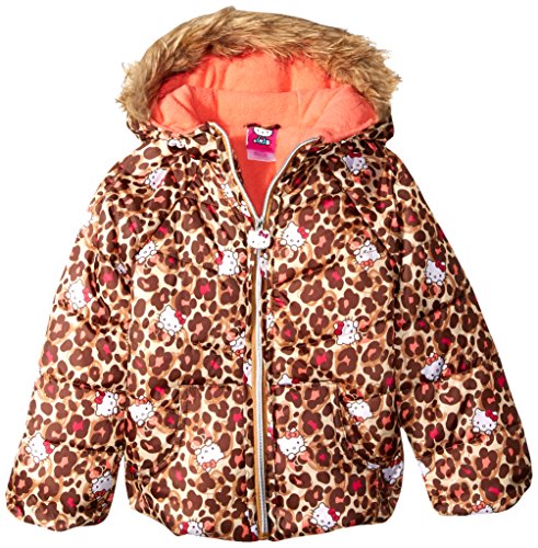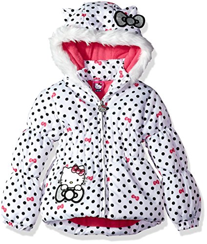 Hello Kitty Toddler Girls' All Over Printed Puffer Jacket with Fur Trim Hood, White, 2T