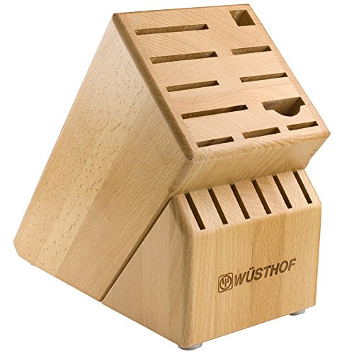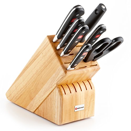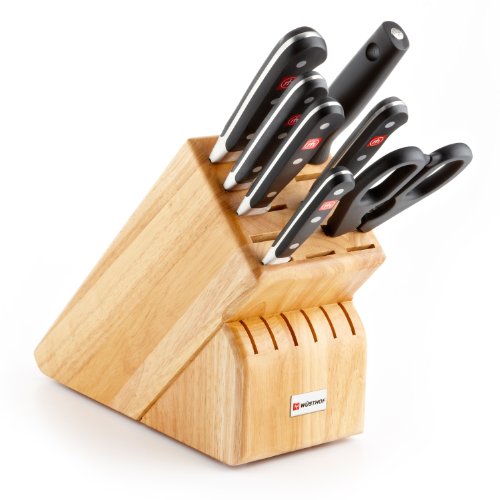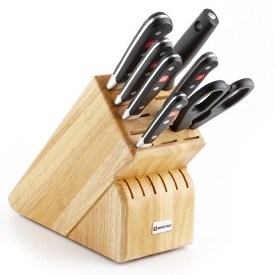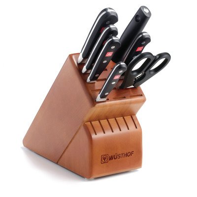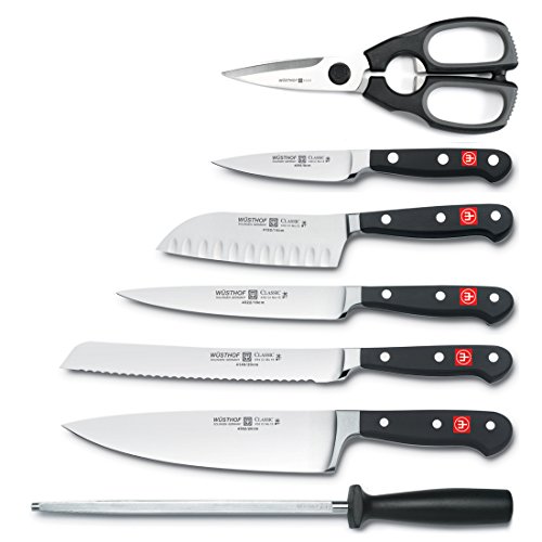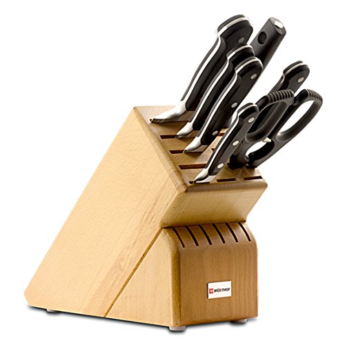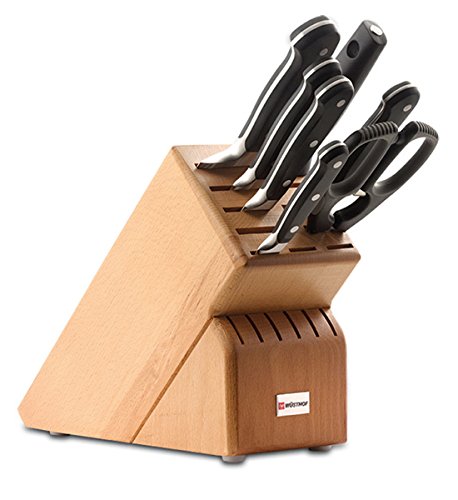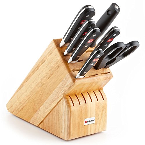 Studio : Wusthof Publisher : Wusthof Product Description 8408 Finish: Beech Features: -Blade material: High carbon stainless steel. -Fully forged knives with ergonomic handles. -Set includes: 3.5" paring knife, 6" utility knife, 5" santoku knife, 8" bread knife, 8" chef's knife, 9" sharpening steel, kitchen shears and 17 slot block. Number of Items Included: -8. Pieces Included: -Bread knife/Chef's knife/Kitchen shear/Paring knife/Santoku knife/Sharpening steel/Utility knife. -Classic collection. Blade Material: -High carbon stainless steel. Dimensions: Overall Product Weight: -8 Pounds. 0