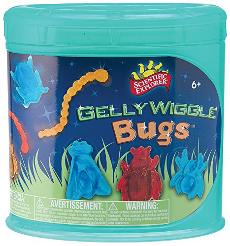 Scientific Explorer Gelly Wiggle Bugs lets you make 15 wiggly jiggly bugs! Mold 5 different icky insects in 3 different colors and play with them on a mat that looks like grass! Make worms, flies, spiders and more. Includes 2 bug molds, 1 stir stick, beaker, 3 jiggly gel powder (0.53 oz. gelatin), laminated paper, 4in. x 7in. play mat and easy instructions. Recommended for children 6 years of age and older.Feature