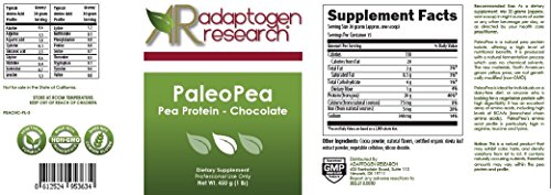 -. Binding : Health and Beauty -. Brand : Adaptogen Research -. EAN : 0612524953634 -. Feature : Vegetarian protein with high digestibility. / Excellent array of amino acids, including high levels of BCAAs (branched chain amino acids). / Non-GMO -. IsAdultProduct : 0 -. Label : Adaptogen Research -. Manufacturer : Adaptogen Research -. MPN : PEACHC-PL-2 -. PartNumber : PEACHC-PL-2 -. ProductGroup : Health and Beauty -. ProductTypeName : HEALTH_PERSONAL_CARE -. Publisher : Adaptogen Research -. Studio : Adaptogen Research -. Title : PaleoPea, Pea Protein 450 grams - Chocolate -. UPC : 612524953634