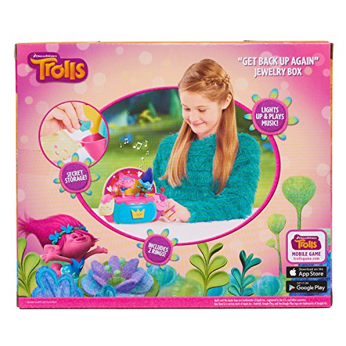 -. Binding : Toy -. Brand : Trolls -. EAN : 0886144650260 -. Feature : Sing and dance along with Poppy and Branch with the DreamWorks Trolls "Get Back Up Again" Jewelry Box! Press the button on this colorful jewelry box to see your favorite pair of sing-song adventurers dance to the upbeat hit song, "Get Back Up Again" from the film! / Trolls Jewelry Box features dancing Poppy and Branch figures. / Press the button to activate dance moves and hear the "Get Back Up Again" song from the film. / Jewelry box really lights up! / Features so many places to store your jewels! Including: two cupcake-shaped containers, a ring and bracelet bar and a pull-out drawer. / Set comes with two rings. / Requires 3 x AAA batteries (included) / Ages 3+ -. IsAdultProduct : 0 -. Label : Just Play -. Manufacturer : Just Play -. Model : JPL65025 -. MPN : JPL65025 -. PackageQuantity : 1 -. PartNumber : JPL65025 -. ProductGroup : Toy -. ProductTypeName : TOYS_AND_GAMES -. Publisher : Just Play -. Studio : Just Play -. Title : Just Play Trolls Charms Collection Jewelry Box -. UPC : 886144650260 -. Warranty : No Warranty