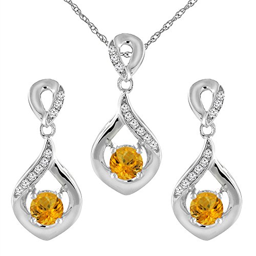 -. Title : 14K White Gold Natural Citrine Earrings and Pendant Set with Diamond Accents Round 4 mm