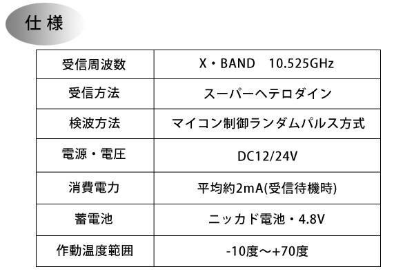 | 仕様 | 受信周波数:X・BAND 10.525GHz 受信方法:スーパーヘテロダイン 検波方法:マイコン制御ランダムパルス方式 電源・電圧:DC12/24V 消費電力:平均約2mA(受信待機時) 蓄電池:ニッカド電池・4.8V 作動温度範囲:-10度~+70度 |