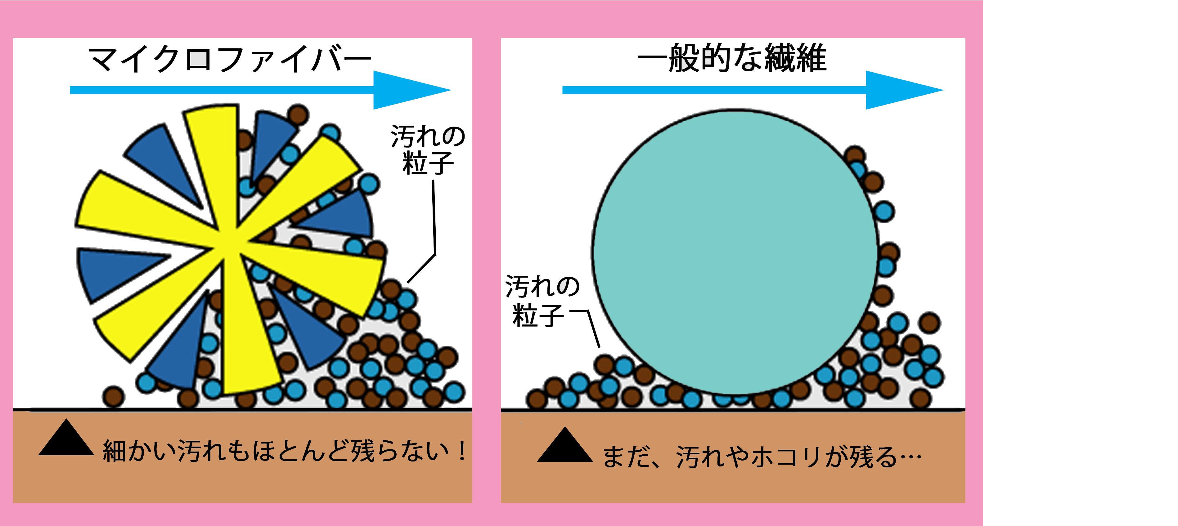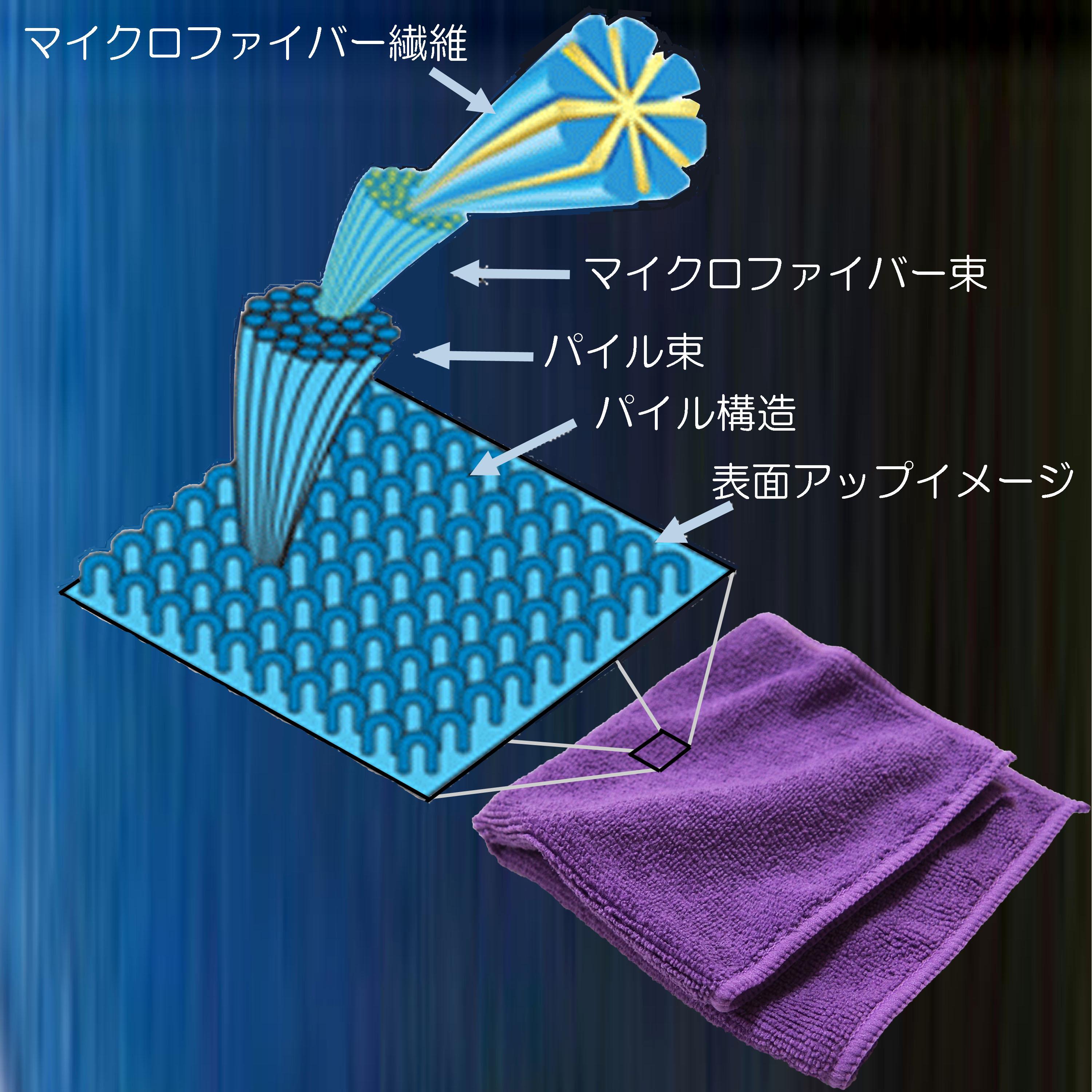 マイクロファイバー繊維の断面は断面が多角形の形状をしているので、細かいホコリや水分、油汚れなどを吸着して取り除いてくれます。