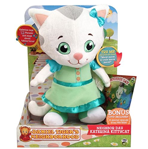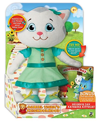 -. Binding : Toy -. Brand : PBS Kids -. EAN : 0678352250710 -. Feature : Katerina Kittycat really talks and sings! She can say and sing 14 different phrases like "Making something is one way to say I love you" and "Thank you for everything you do." / Cuddly and soft, perfect for tiger-riffic playtime, anytime / About 12" tall, just the right size for little hands / Includes Neighbor Day dvd -. IsAdultProduct : 0 -. Label : Jakks -. Manufacturer : Jakks -. MPN : 25071 -. PackageQuantity : 1 -. PartNumber : 25071 -. ProductGroup : Toy -. ProductTypeName : TOYS_AND_GAMES -. Publisher : Jakks -. Studio : Jakks -. Title : Daniel Tiger's Neighborhood Neighbor Day Talking Katerina Kittycat Plush with DVD -. UPC : 678352250710