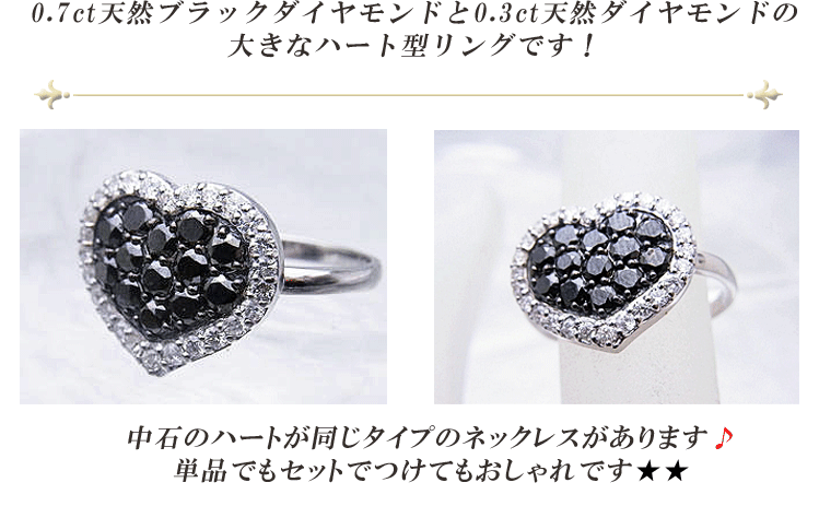 ■商品説明 0.7ct天然ブラックダイヤモンドと0.3ct天然ダイヤモンドの大きなハート型リングです。中石のハートが同じタイプのネックレスがあります。
