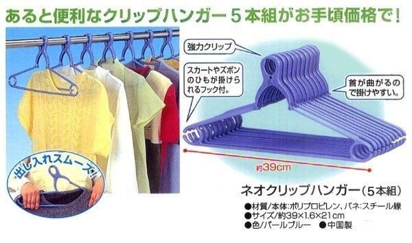 強力バネで竿やロープをガッチリクリップ、スカートやタンクトップも吊るせます。 製造国:中国 素材・材質:本体:ポリプロピレンバネ:スチール線 商品サイズ:約39×1.6×21cm ※サプライヤー直送品 ご注文後、当日~1営業日後の出荷となります【商品名】ネオクリップハンガー5本組パールブルー(C)