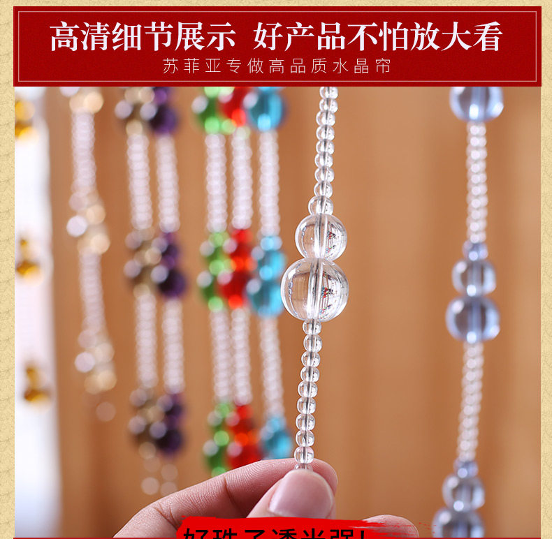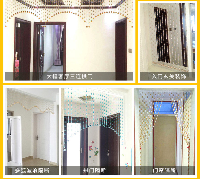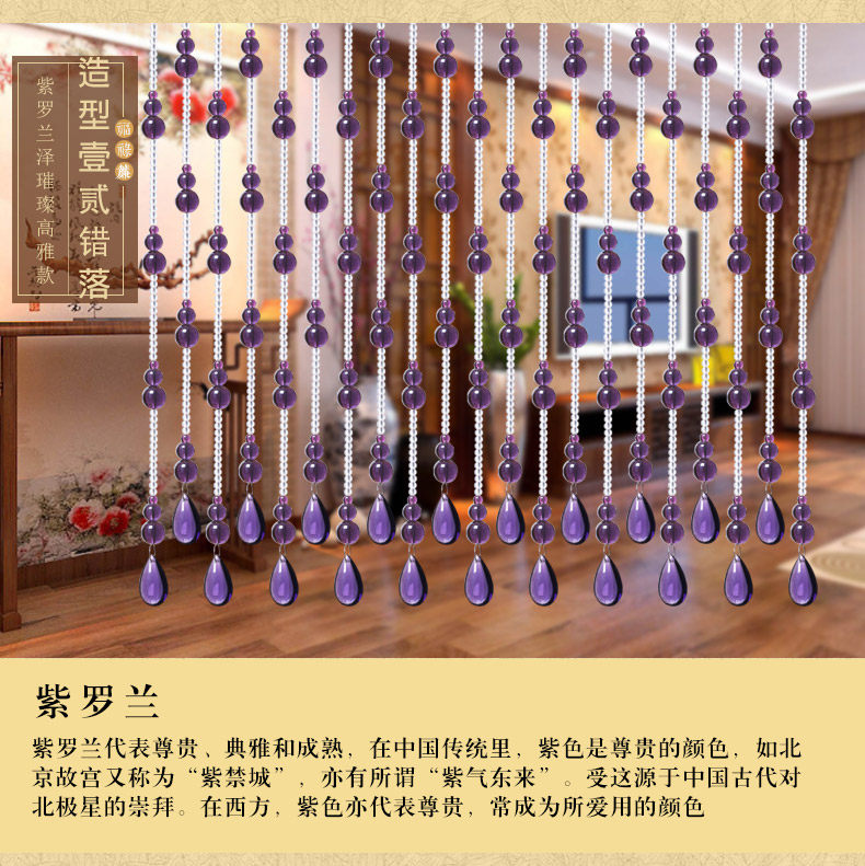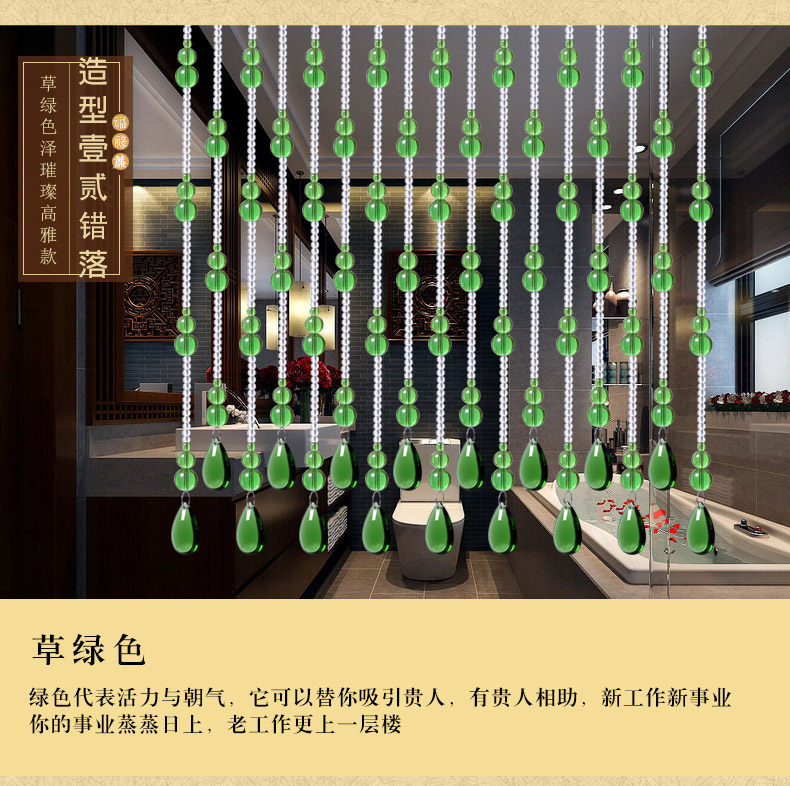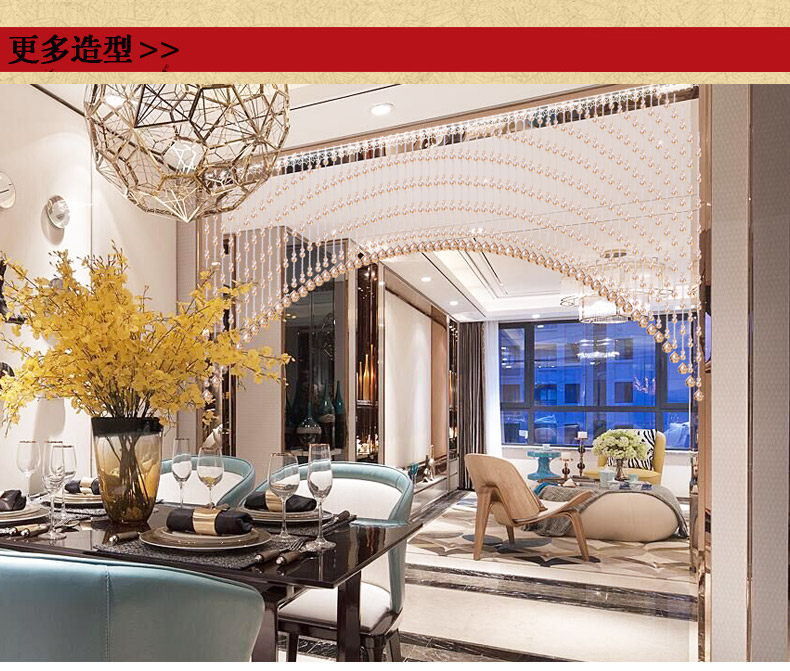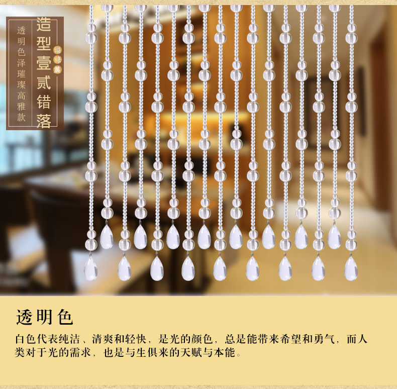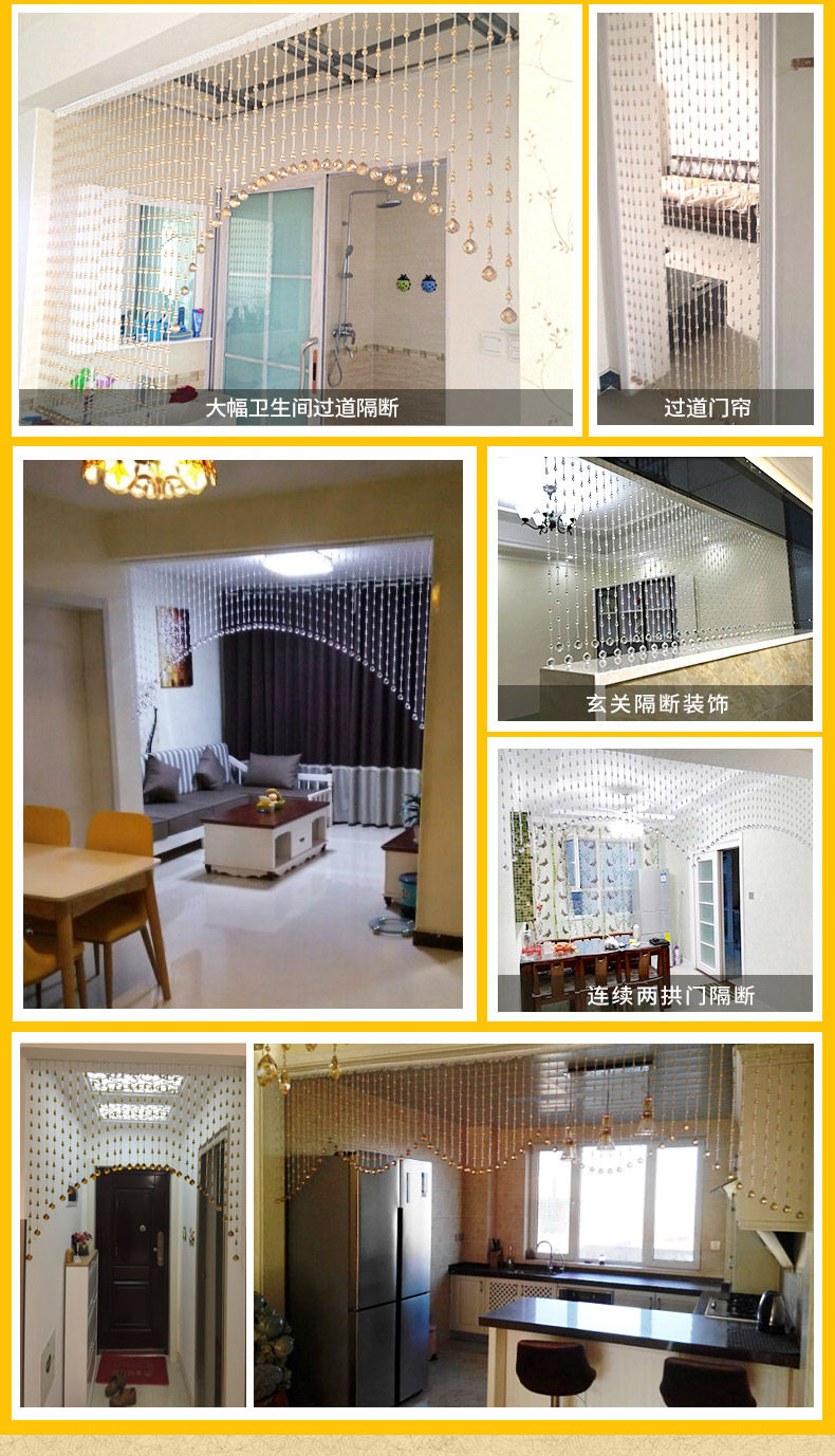 水晶珠帘一般适用于室内客厅、卧室房间、餐厅(厨房)、鞋柜、屏风、玄关、卫生间(厕所)、过道、做隔断装饰。很多亲们可手 工DIY吊灯帘、壁帘、垂帘、床头帘、也适用于服装店橱窗婚房展会布置,本公司也承接大型娱乐KTV酒店工程单! |