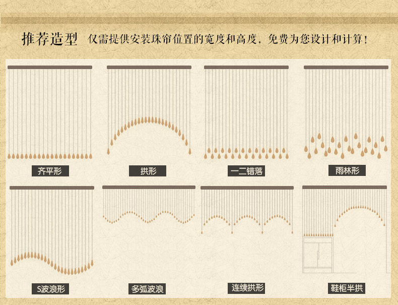 珠帘风格有:田园 日韩欧式现代时尚简约 地中海可爱卡通个性等等,可按亲的装修风格和喜好选择合适的款式. |
